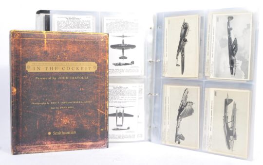 Large original RAF British Military Aviation WWII black & white photos (x12) including spitfires and sea planes, recognition cards (42), along with various other aeronautical postcards, oddments, 'in the cockpit' book and Spitfire paperwork.