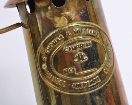 A vintage 'E Thomas & Williams Ltd, Makers, Aberdare, Wales', brass paraffin oil lamp with hanging hook. The brass name plate stamped 'Cambrian Colliery, Serial No. 74475'. Miners safety lamps were traditionally used to provide illumination in coal mines and were designed with an enclosed flame to operate in areas which may contain coal dust or gases. Unused - as new. Measures 25.5cm (height).