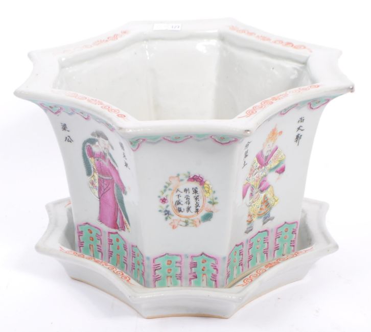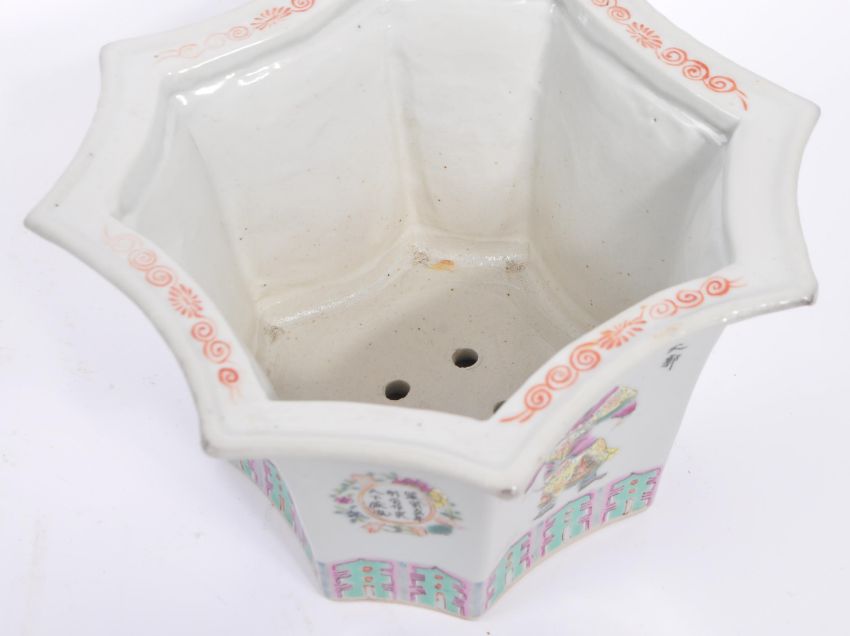 A 1930s Chinese Oriental wooden bowl / planter having an hexagonal mouth rim over a hand painted body. The bowl raised on hexagonal plinth base. Decorated Cinese script to alternative paneling. Measures approx. 15cm (height).