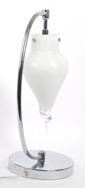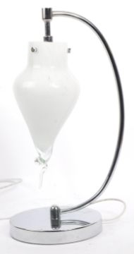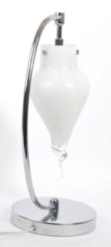 A vintage 20th Century Art Deco style table / desk lamp light. Having a hand made shaped mottled glass shade on curved chrome stem, raised upon a stepped circular base. Measures 46cm (height).