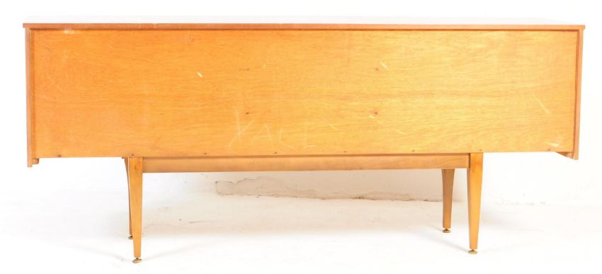 Stonehill Furniture - A retro 20th century teak sideboard credenza. Of rectangular form with a bank of three chequered decorated drawers to centre, flanked by twin sliding cabinet cupboard doors with shelves to interior. All raised on square tapering legs. Measures approx. 78cm x 182cm x 45cm.