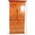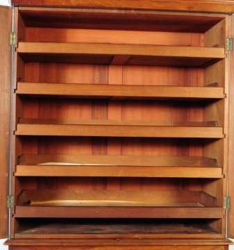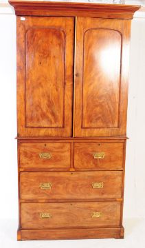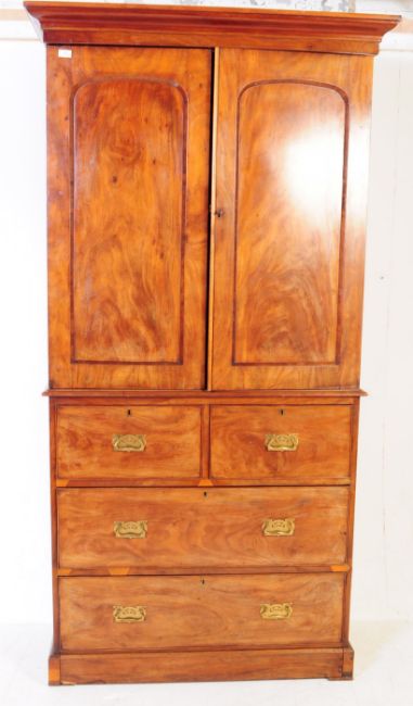 A 19th century George III flame mahogany linen press on chest. The base with plinth and short and deep drawer chest of drawers with brass handles. Twin door cupboard above with flared pediment. Measuring approx 220cm x 102cm x 45cm.