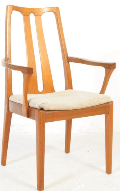 Nathan Furniture - A vintage mid 20th century teak extending dining table and chairs. Of curved rectangular form with folding leaf to underside. Together with six chairs with vertical slatted backrest, straight flat elbow rests on a drop in cushioned seat. All square upright supports. Measures 75 x 153 x 100 cm.
