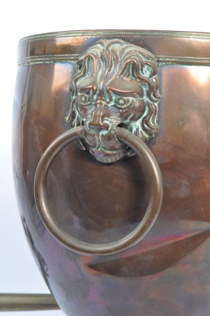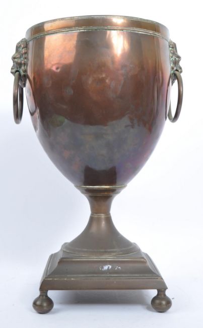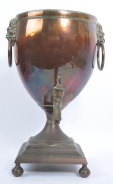 19th century Victorian copper and brass samovar. Terraced base with finial feet, brass tap with lion mask handles to the sides.  Lacking top. Measures approx 40 x 21 x 21 cm.
