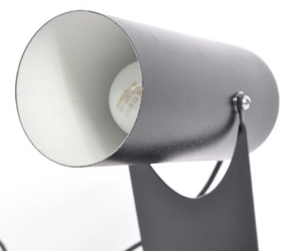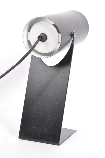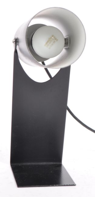 A late 20th century stainless steel industrial table desk lamp. Having a black conical tubular shade, with ebonised right angled square base. Measures approx. 30cm (height - fully raised).
