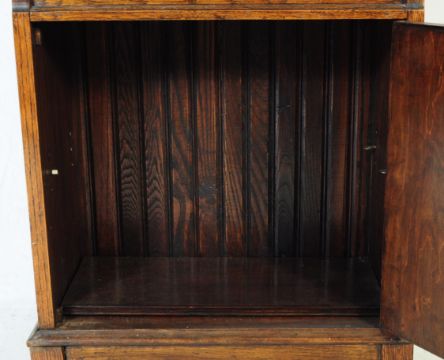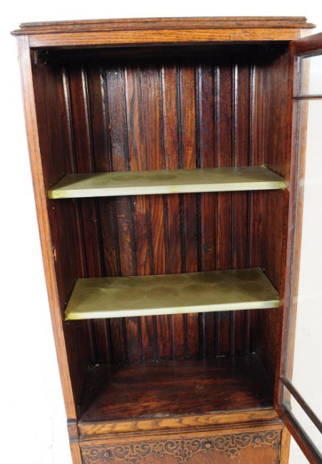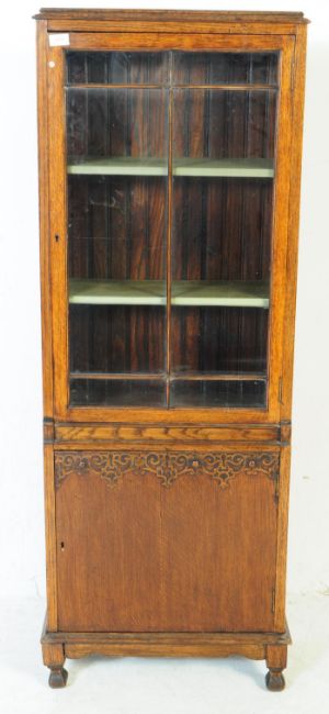 A 1920's oak pedestal bookcase cabinet. Raised on a plinth base having an upright thin body comprising a glass door bookcase over small cupboard to the base. Measuring approx 151cm x 54cm x 26cm.