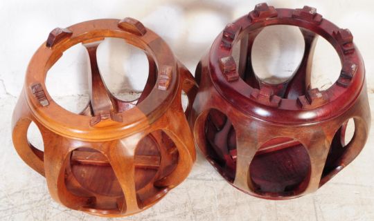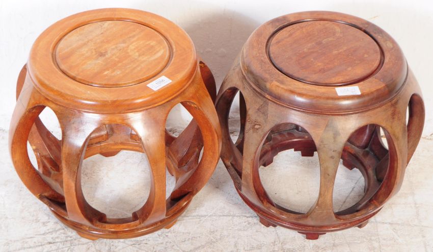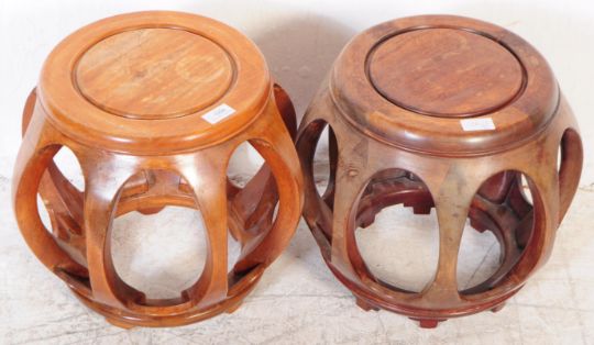 A pair of vintage 20th century Chinese hardwood stools. Of circular form with pierced bentwood sides on a circular base. Measures approx. 35cm x 33cm x 33cm.
