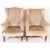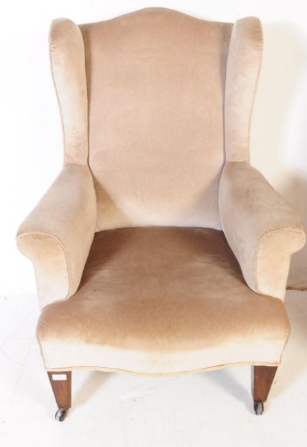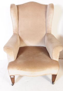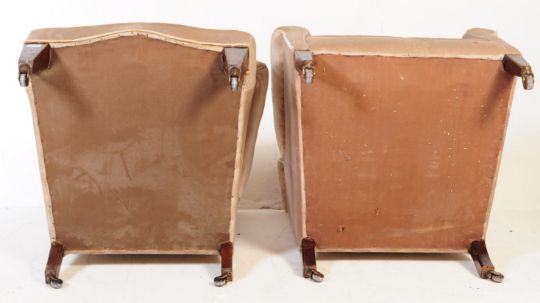 A pair of Edwardian mahogany wingback Chesterfield armchairs. Raised on square tapering legs with castors having overstuffed frames with barrel arms and winged back rest. Measuring approx 98cm x 78cm x 70cm.
