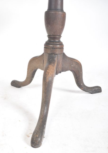 A Victorian 19th century oak tilt top tripod side coffee table. The table having a circular tilt top over a turned central support. Raised on cabriole supports. Measures approx. 70cm tall x 71cm in diameter.