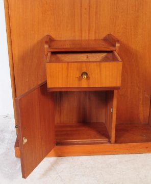 British Modern Design - A retro mid 20th century circa 1970s teak hall stand. The hall stand having hat rail to top over backboard with three gilded coat hooks and an atomic style mirror with umbrella stand and cupboard to base. Measures approx 85 x 78 x 25 cm.