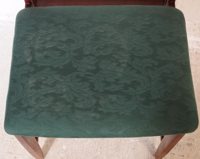 A Mid century teak dining room table and chairs. The suite comprising an extending dining table raised on square tapering legs together with a set of four matching upholstered dining chairs with pad seats and square tapering legs. Measures approx 75 x 152 x 91 cm (Extended 198 cm).