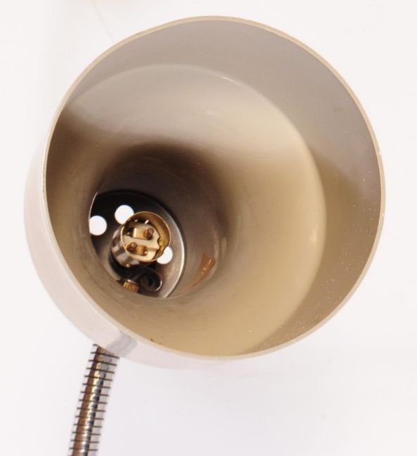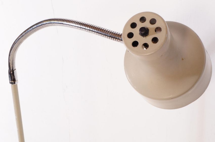 A mid 20th century circa 1970s grey standard floor standing lamp. The lamp having conical shade with gooseneck and tubular shaft over circular base. Measures approx 162cm x 27cm x 27cm.