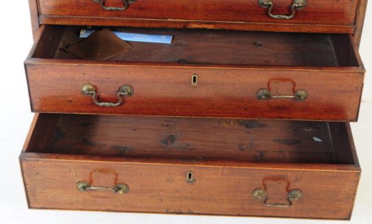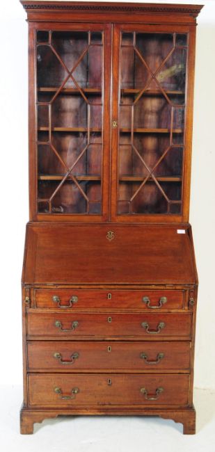 A George III mahogany 19th century library bureau bookcase. Raised on bracket feet with a chest of drawers beneath bureau atop. Brass swing handles with the bureau having an appointed interior within. Twin glazed door bookcase atop. Measuring approx 212cm x 85cm x 50cm.