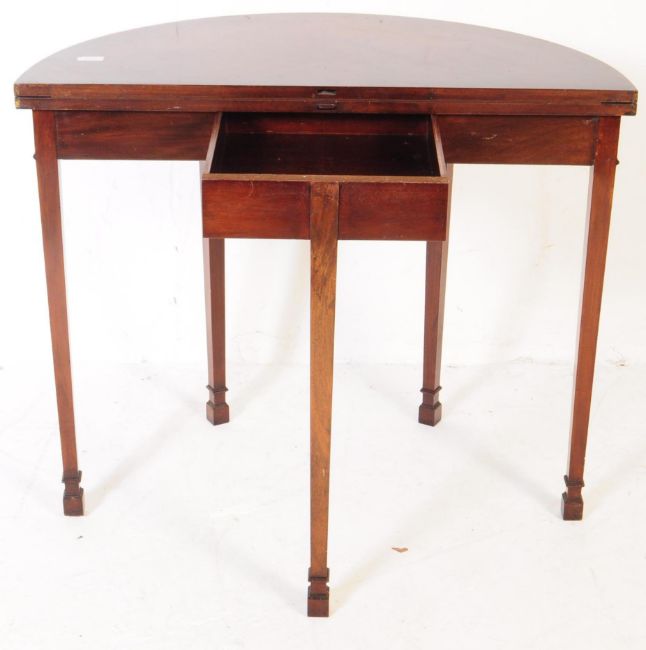 A 19th century mahogany Adams manner card / games table. Raised on square tapering legs with reeded frieze and carved floral cartouches to the leg tops. Fold over baize lined games tabletop. Measuring approx 74cm x 92cm x 92cm.