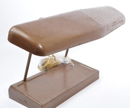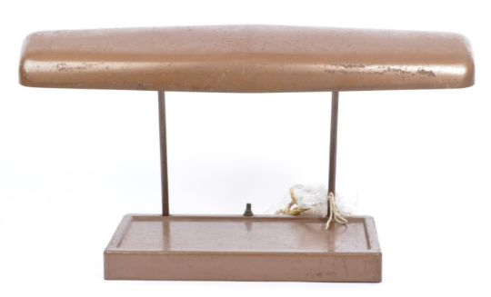 A mid century stainless steel bankers portable light / lamp by Underwriters Laboratories Inc. Having a weighted sloping foot and duel arm supporting a full length stainless steel shade, all in a brown colourway. Measures; 30cm (height).