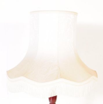A twentieth century Victorian style mahogany standard lamp. Turned and carved vertical column with circular turned and dished base, complete with brass switched lamp fitting to top, along with cage and shaped shade with tassels to bottom edge.  Measures approximately 170cm x 55cm x 55cm.
