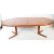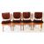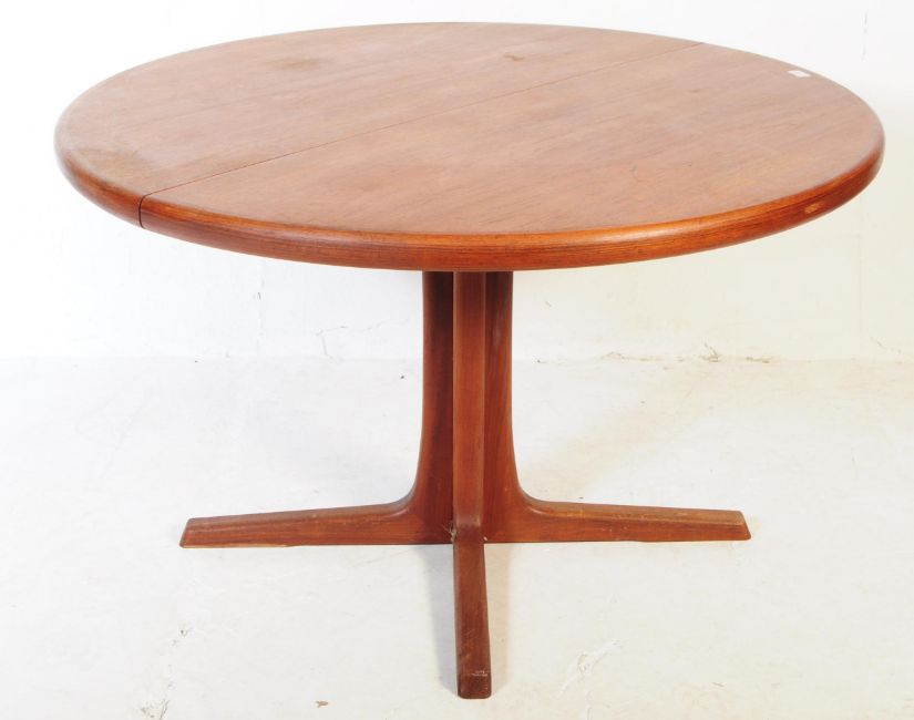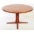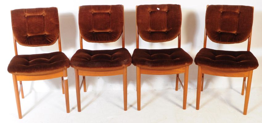 A mid 20th century vintage teak extending dining table with four chairs. The table of round form with splayed legs. With four green upholstered button back and seat chairs with side stretchers. Measures approx. 73cm x 120cm x 120cm (extended 220cm).