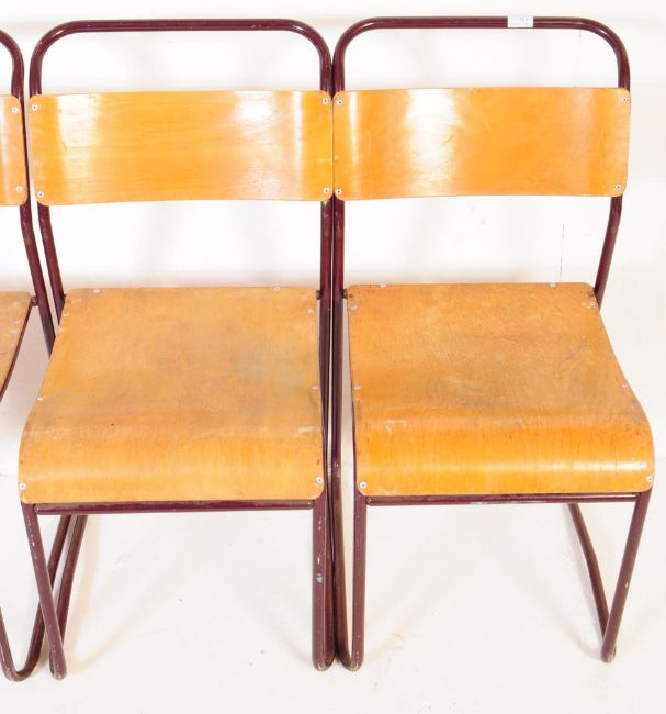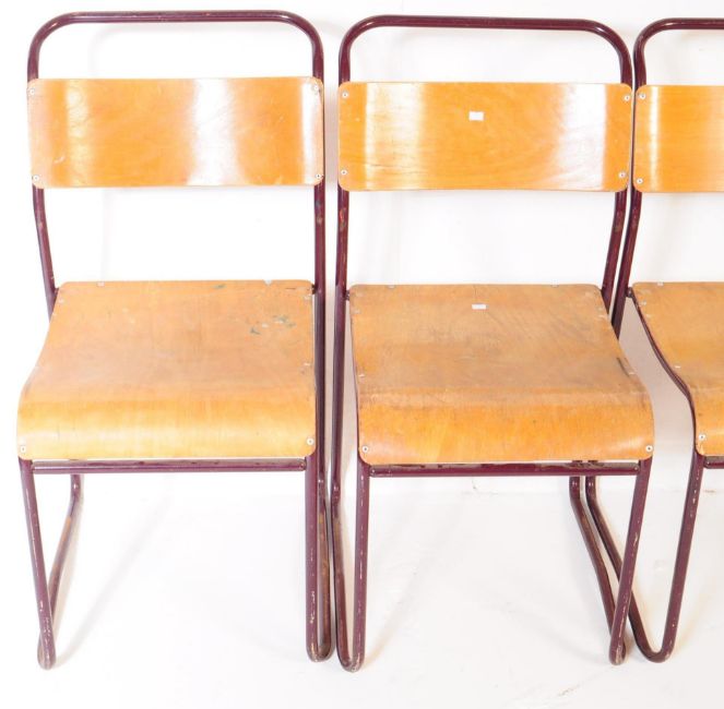 A set of four vintage 20th century stacking school chairs. Having plywood bentwood backrest and seat on brown tubular metal frames. Measures approx. 84cm x 41cm x 50cm.