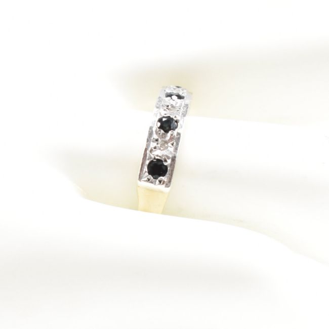 A hallmarked 9ct gold sapphire and diamond half hoop ring. Weight 2.8g. Size Q.5. All weights, measurements and sizes are approximate