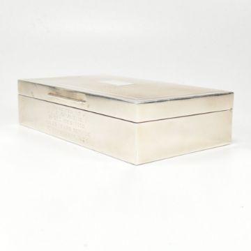 A 1970s hallmarked silver cigar box. The wood lined silver box having an engine turned repeated pattern with central vacant cartouche. Inscribed to front 'Presented to J.K.R Graveney by SCC (West) Ltd for 25 years service 10 September 1976. Hallmarked for London, 1976. Makers mark for S J Rose & Son. Weight approx  252g. Measures approx 15.5cm x 8.7cm x 4.1cm.