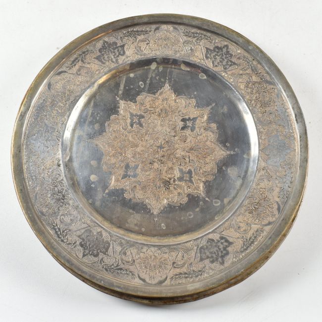 A set of six Persian white metal side plates. The Iranian set each decorated with traditional Persian Ghalam-Kari design. Stamped to base with Persian numerals for 84 (zolotniki) for 875/1000 parts silver. Weight approx 1195.6g. Measures approx 17cm diameter.