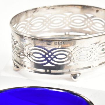 A collection of Victorian and later hallmarked silver condiment pots & salts. The lot to include a Victorian mustard pot having a stepped footed base with beaded rim rising to pierced border, hinged lid and having fitted blue glass liner. Hallmarked for London,1900. Makers mark for  John Charles Lowe. An Edward VII salt cellar having four bun feet rising to oval form with pierced border. Hallmarked for Birmingham, 1905.Makers mark for William Aitken. A salt cellar with gadrooned foot base and etched border. Hallmarked for Birmingham, 1863. Makers mark for George Unite & Sons. To also include a lidded condiment pot with AF glass liner and salt spoon. Combined weight approx 310g. Weight of silver approx 150g. Measures approx 9cm x 4cm x 7cm /5.2cm x 3.7cm.