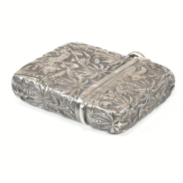 An Indian white metal vesta case. The vesta case having a chased design throughout depicting palm trees and animals including an elephant. Weight approx 45.2g. Measures approx 5cm x 3.5cm x 0.8cm.