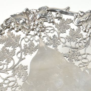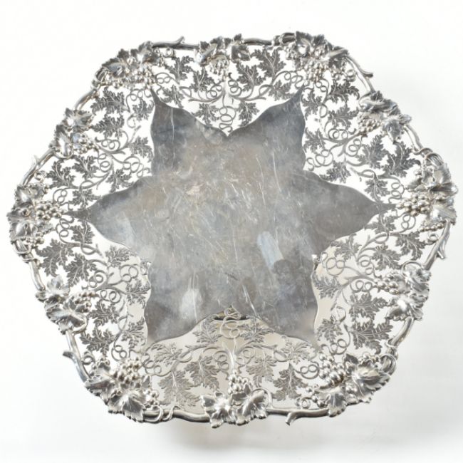 A George V hallmarked silver compote. The footed tray having a footed base rising to hexagonal form with central star pattern and  pierced and moulded grape and vine decoration. Hallmarked for Sheffield, 1932. Makers mark for Atkin Brothers. Weight approx 528.6g. Measures approx 23.5cm x 4cm.