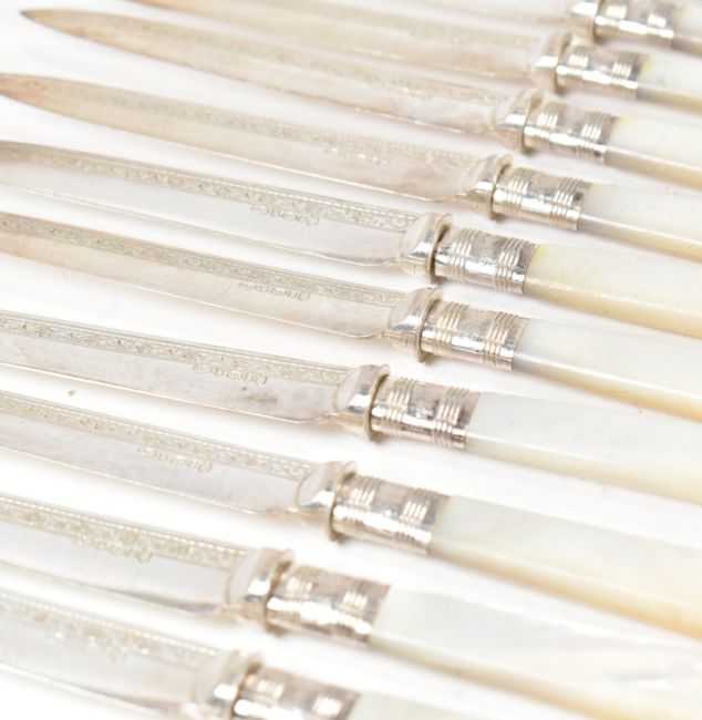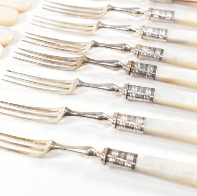 A set of 12  early 2oth century hallmarked silver collared fruit knives and forks. The Edward VII set comprising of twelve knives and twelve forks each having a mother of pearl handle. The knives having a silver plated blade with bright cut floral design and being stamped EP AS & GR S. The silver collars hallmarked for Sheffield, 1908. Makers mark for  Sutherland & Roden (George Guirren Rhoden). Combined weight approx 855g. Measures approx 19.5cm x 1.5cm.  .