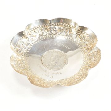 A collection of hallmarked silver and white metal items. The lot to include a cased Sterling silver trinket dish. The middle eastern dish having a repousse scrolled decoration and being set with a one rupee Indian coin dated 1916 and inscribed 'Penny Christmas 1978'. Stamped Sterling Silver. A Victorian hallmarked silver propelling pencil set with purple stone. Makers mark rubbed. Hallmarked for Birmingham, 1887.  A silver mounted wooden trinket box. The silver mount hallmarked for Birmingham, 1997. Makers mark RH for Ray Hall. Two button hooks with hallmarked silver handles. A white metal miniature model of a pepper. Unmarked, surface tests indicate silver. A mounted medal for the General board of administration of the civil hospitals of Lyon. Unmarked. Surface tests indicate silver. Combined weight approx 470g. Measures approx 8.3cm x 0.7cm (pencil)  / 10.5cm diameter (dish).