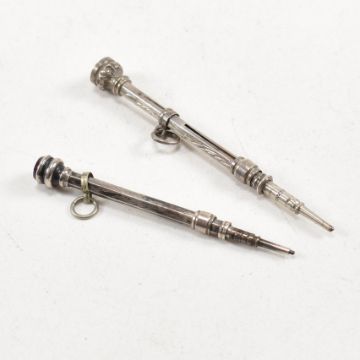 A 1930's pair of hallmarked silver lorgnettes and two white metal propelling pencils. The lorgnettes marked .925 with import mark for Birmingham and date letter F for 1930. Makers mark S&Co for Steinhart & Co. The two propelling pencils each with paste set terminals. Both unmarked. Surface tests indicate silver. Combined weight 30.9g. Measures approx 12cm x 10cm (glasses) / 5.5cm x 0.5cm (pencil).