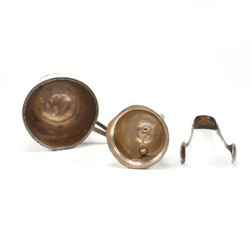 A collection of Victorian and later hallmarked silver items. The lot to include a George VI hallmarked silver cup. Hallmarked for Birmingham, 1942. Makers mark S&M for Sanders & Mackenzie (Ernest Wilfred Sanders & Henry Arthur Mackenzie). A pair of Victorian silver sugar tongs. Hallmarked for Birmingham, 1898. Makers mark R.P for Robert Pringle & Sons. A contemporary silver bell stamped 925 and hallmarked for Birmingham 2000. Combined weight approx 198.5g. Measures approx 9cm x 9cm (tankard)