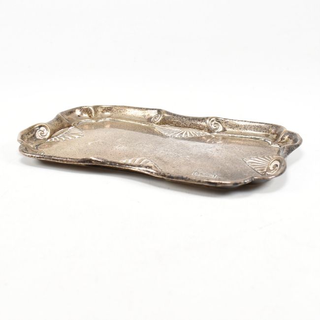 A Victorian hallmarked silver pin tray. The tray being of rectangular form and having a moulded scrolled design. Hallmarked for Chester, 1899. Makers mark only partially legible. Weight approx 71.7g. Measures approx 14cm x 9cm.