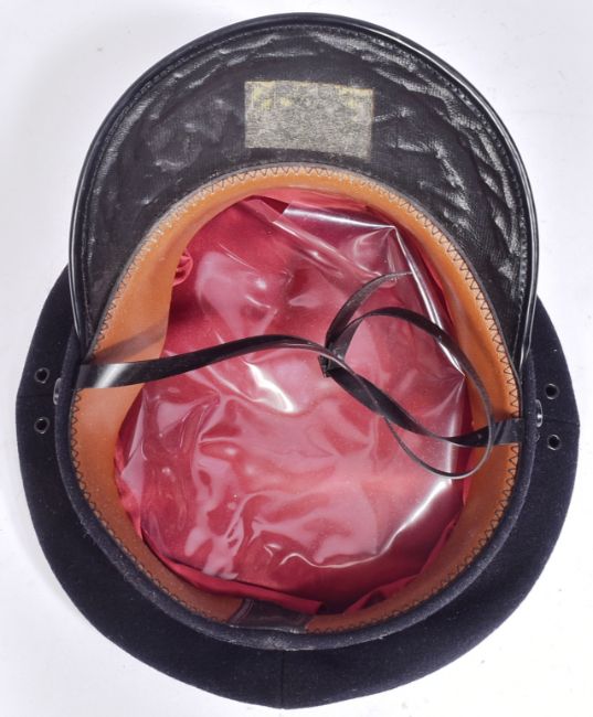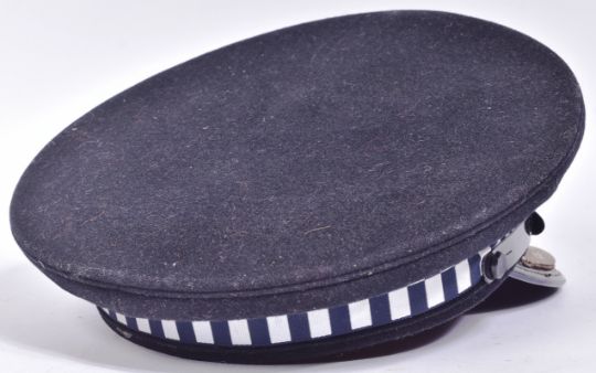 A vintage Scottish Chief Superintendent  Police uniform hat / cap. The flat peaked cap having a silver bullion thread badge to the front along a checkerboard headband. The patent leather peak having a silver threat band and row of oak leaves. Retaining the original leather lining and chin strap.