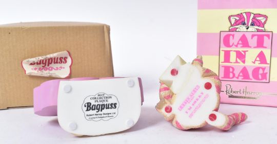 Bagpuss - Robert Harrop - X2 Statues / Figurines. Comprising of; BGB03 Cat in a Bag 'I'm Sorry', and BGCP Collection Plaque. Highly detailed resin statue / figurine from the Oliver Postgate & Peter Firmin animated series.