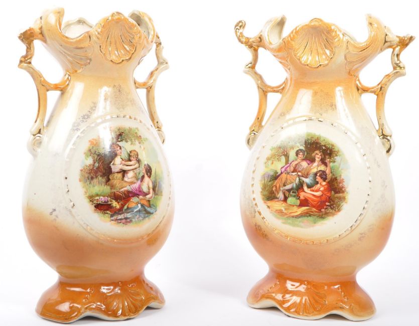A pair of 1909-1917 Wild & Adams, Longton, Stoke-on-Trent pottery mantle vases, decorated with flowers to rear of both, one having a trio of Ladies to the front and the other two ladies and a child.  WA&L makers stamp to base of both. Measure approximately 16cm x 10cm x 30cm tall.