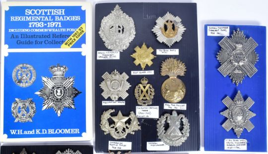 A collection of WWI First and WWII Second World War (and other) regimental cap badges of largely Scottish interest to include; 9th Battalion Highland Infantry, 1st Battalion Black Watch Royal Highlanders, Gordon Highlanders (Boer War), Seaforth Highlanders, Royal Scots Fusiliers, Kings Own Scottish Borderers and more. Mounted with identification labels.