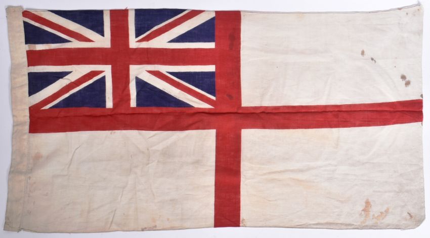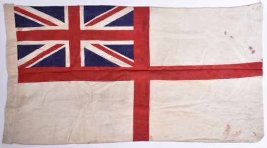 Royal Navy Interest - a Royal Navy ensign flag along with x3 teak wood pieces from naval ships comprising HMS Warrior, HMS Iron Duke (Jutland) and HMS Ormonde. Flag measures approx 45x85cm.