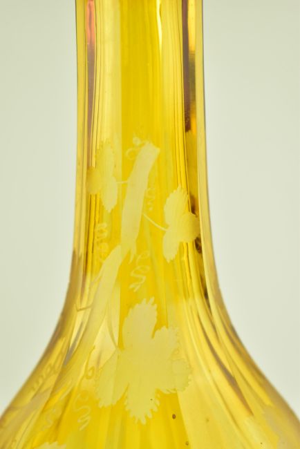 A mid 19th century Bohemian engraved amber cut glass decanter with stopper. The glass bottle with engraved design of fruiting vine and facet cut edges. Light nibbles to the stopper & rim. Measures approx. 32cm tall.