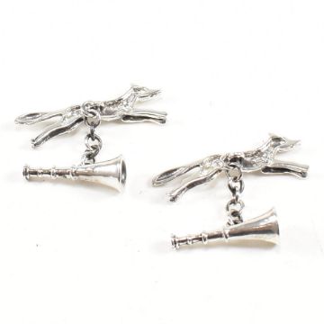 A pair of contemporary silver fox and horn cufflinks. Hunting interest.  Weight approx 6.3g. Measures approx 2.5cm x 3cm.