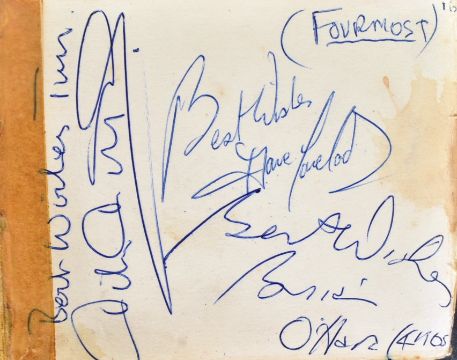 Music Autographs - 1960s - an autograph album owned by a Bath gentleman who worked at The Pavilion in the 1960s / 1970s. He was able to obtain autographs from most of the acts who played there. This autograph book contains: The Yardbirds (including Eric Clapton), Bern Elliott, Pretty Things, The Remo Four, The Preachers, Colin Anthony, The Eagles (the British band, not the American band), The Undertakers, The Searchers, The Tornados, The Fourmost, The Dennisons, Cilla Black, The Savages, Mersey Beats, The Pirates, The Diamonds, The Four Pennies, The Big Three, Little Richard & The Mojos, The Migil Five, The Washington DC's, The Hollies (inc Graham Nash), The Animals, The Nashville Teens, Gene Vincent, The Cruisers, David Berry, The Zombies, The Naturals, Herman's Hermits, Swinging Blue Jeans, The Rebel Rousers, The Toggery Five, Mannfred Mann, The Poets, The Beat Merchants, Them and others. Signed back to front, upside down and generally 'well filled'. Most bands annotated either by the band themselves or by the autograph book owner.