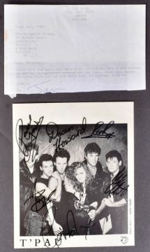 T'Pau (English Pop Band formed 1986) - an original vintage Siron Records autographed promotional photograph, signed by all six members of the band in black ink - Carol Decker, Ronnie Rogers, Michael Chetwood, Dean Howard, Paul Jackson and Tim Burgess. All undedicated. Measures 7x6"