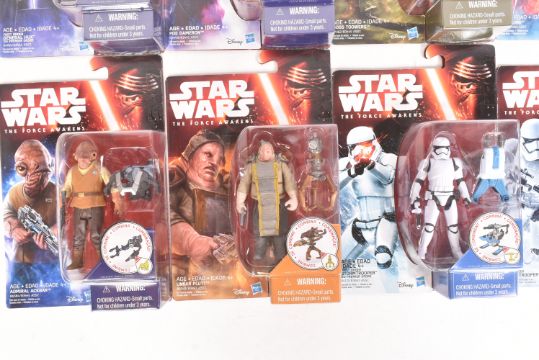 Star Wars - The Force Awakens - collection of x10 2015 Hasbro maded MOC carded action figures, comprising: First Order Stormtrooper, PZ-4CO, Nien Nunb, Goss Toowers, Poe Dameron and others. All factory sealed, contents mint and unopened. As new.