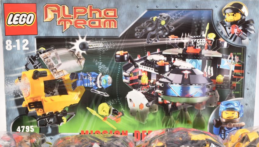 Lego - a collection of x8 Lego Aqua Team sets comprising; 4795 Ogel Underwater Base and AT Sub, 4790 Alpha Team Deep Sea Robot Diver, 4791 Alpha Team Sub-Surface Scooter, 4792 Alpha Team Navigator and ROV, 4793 Ogel Sub Shark, 4794 Alpha Team Command Sub, 4796 Ogel Mutant Squid and 4797 Ogel Mutant Killer Whale. All sets with original instructions, bagged and housed within the box for set No. 4795.