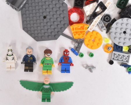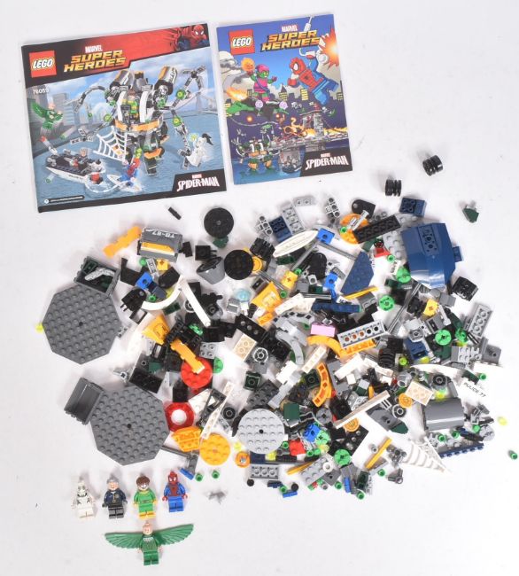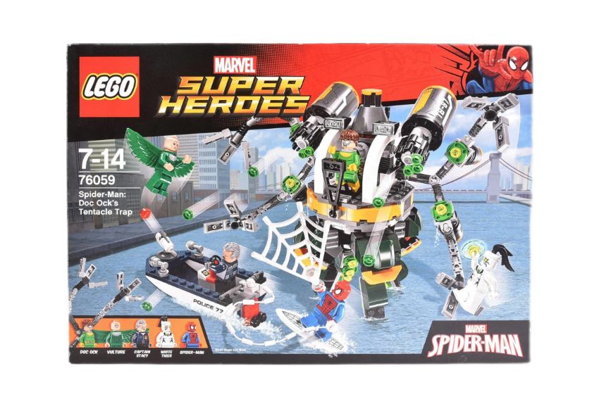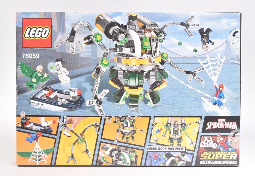 Lego - an original Lego Marvel Super Heroes set No. 76059 Spiderman: Doc Ock's Tentacle Trap. The set rebagged, with all minifigures, instructions and original box. Box open to one side only.