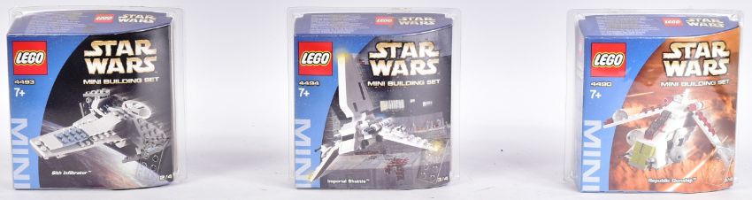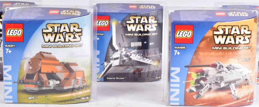 Lego - a collection of x6 Lego Star Wars mini building sets comprising; 4490 Republic Gunship, 4491 MTT, 4492 Star Destroyer, 4493 Sith Infiltrator, 4494 Imperial Shuttle and 4495 AT-TE. The sets rebagged, with instructions and good original packaging.