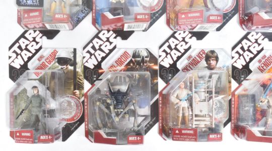 Star Wars - 30th Anniversary 77-07 - a collection of x10 2007 Hasbro made MOC carded action figures with 'Exclusive Collector Coin'. Comprising: Obi-Wan Kenobi, Tri-Droid, Darth Vader, Imperial Evo Trooper, Rebel Honor Guard, Mace Windu, Han Solo, and Luke Skywalker. All factory sealed, contents mint and unopened. As new.