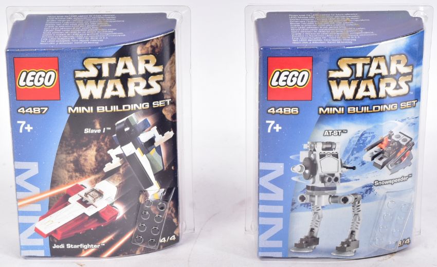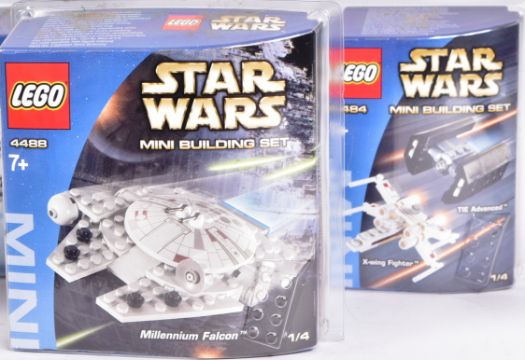 Lego - a collection of x6 Lego Star Wars mini building sets comprising; 4484 X-Wing Fighter & TIE Advanced, 4485 Anakin's Podracer & Sebulba's Podracer, 4486 Snowspeeder & AT-ST, 4487 Slave I & Jedi Starfighter, 4489 AT-AT and 4488 Millennium Falcon. The sets rebagged with instructions and original packaging.