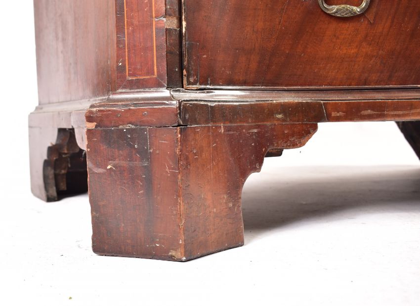 A George III early 19th century mahogany serpentine fronted chest of drawers. The chest having a shaped cross-banded top over a bank of four twin handled drawers. Each drawer with brass intricately moulded drop handles & escutcheons. Raised on bracket feet. Measures approx. 86cm x 115cm x 56cm.