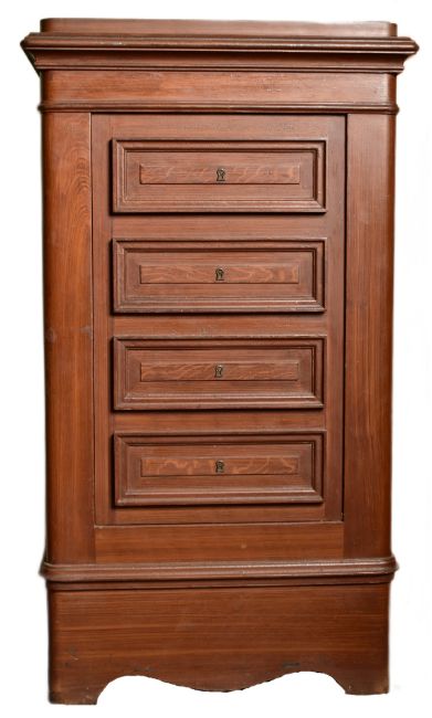 A 20th century solid cast iron bachelor chest of drawers shaped floor safe. The safe in the shape of an antique bachelor chest of drawers. The lower side of one of the drawers moves to reveal the key combination. Opening to reveal an empty interior. Measures approx. 103cm x 57cm x 44cm. Weighs approx. 250kg.